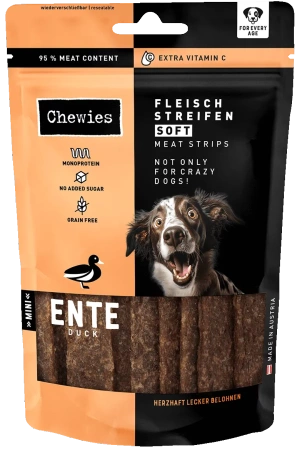 - Chewies Meat Strips Mini Przysmak Dla Psa Kaczka 70g to delikatnie suszone mięso najwyższej jakości, które stanowi pożywną przekąskę dla Twojego pupila. Bez dodatku zbóż, z jednym źródłem białka zwierzęcego.