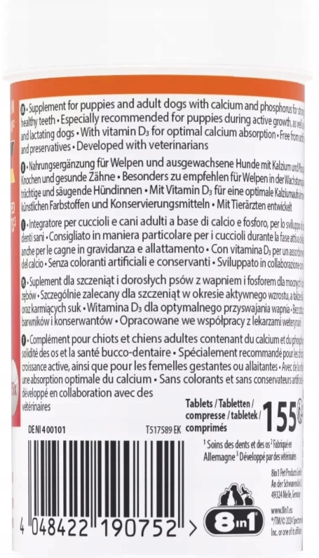 8in1 Vitality Wapń jest szczególnie polecany dla szczeniąt w okresie intensywnego wzrostu, gdy zapotrzebowanie na wapń i fosfor jest największe.