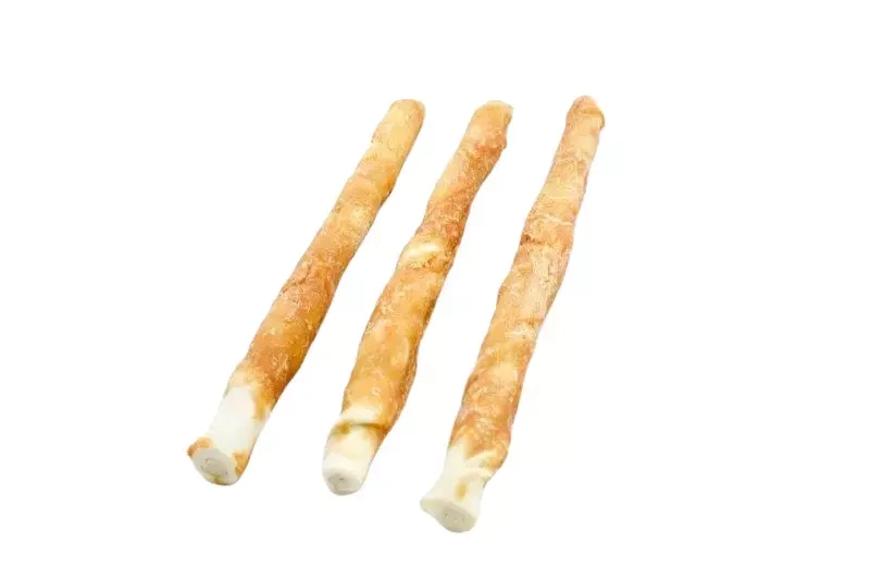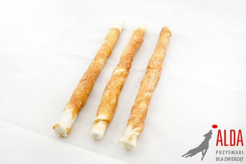 Pałka ze skóry wołowej owinięta mięsiem z piersi kurczaka dla psów