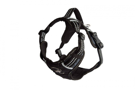 Szelki posiadają dwie regulacje w obwodzie szyi i na wysokości klatki piersiowej, dzięki czemu możemy idealnie dopasować je do naszego psa. doskonała widoczność w ciemności dzięki przeszyciu grubą odblaskową nicią i odblaskowemu logo na piersi psa.