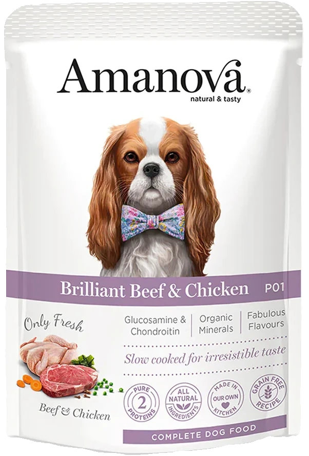 Mokra karma dla psa Amanova Dog Adult Brilliant Beef & Chicken ze świeżym kurczakiem i wołowiną.