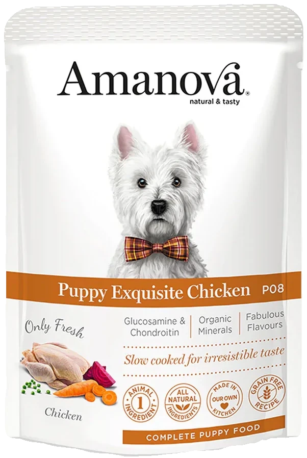 Mokra karma dla psa Amanova Puppy Exquisite Chicken ze świeżym mięsem kurczaka, jedynym źródłem białka zwierzęcego.