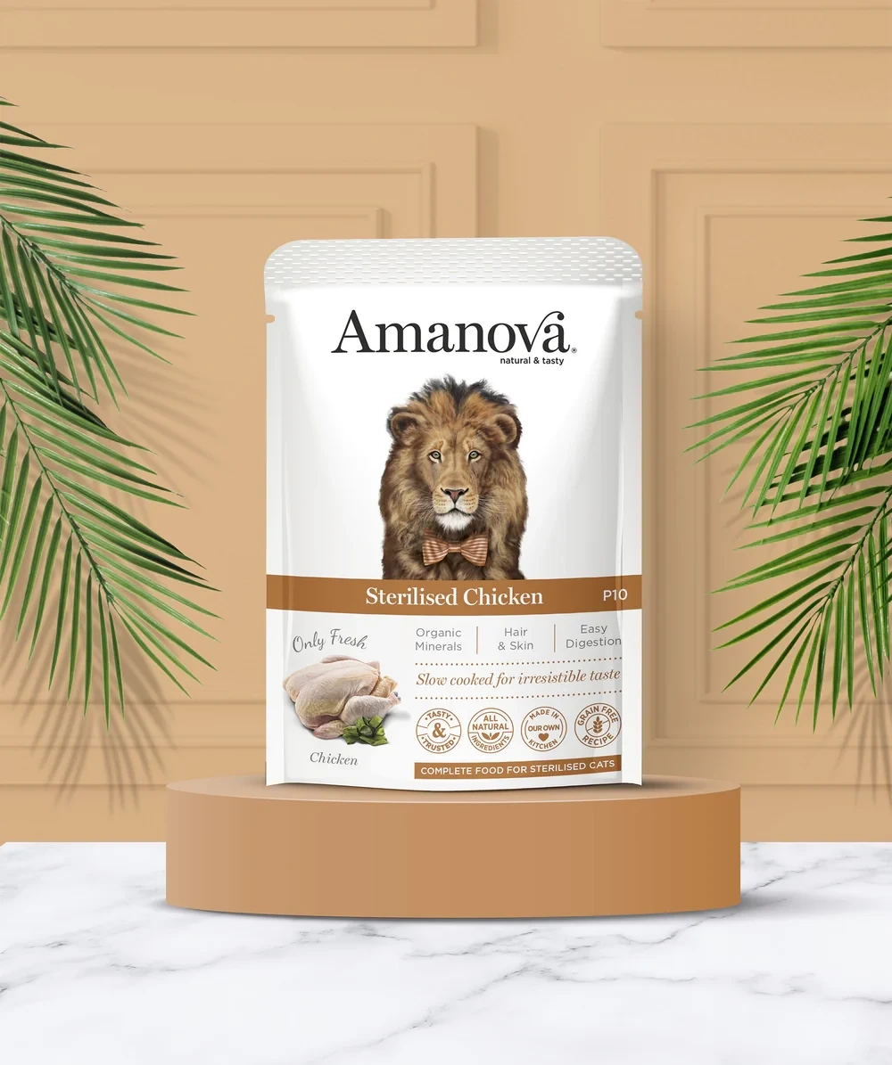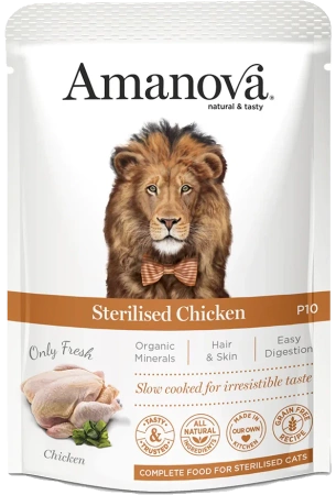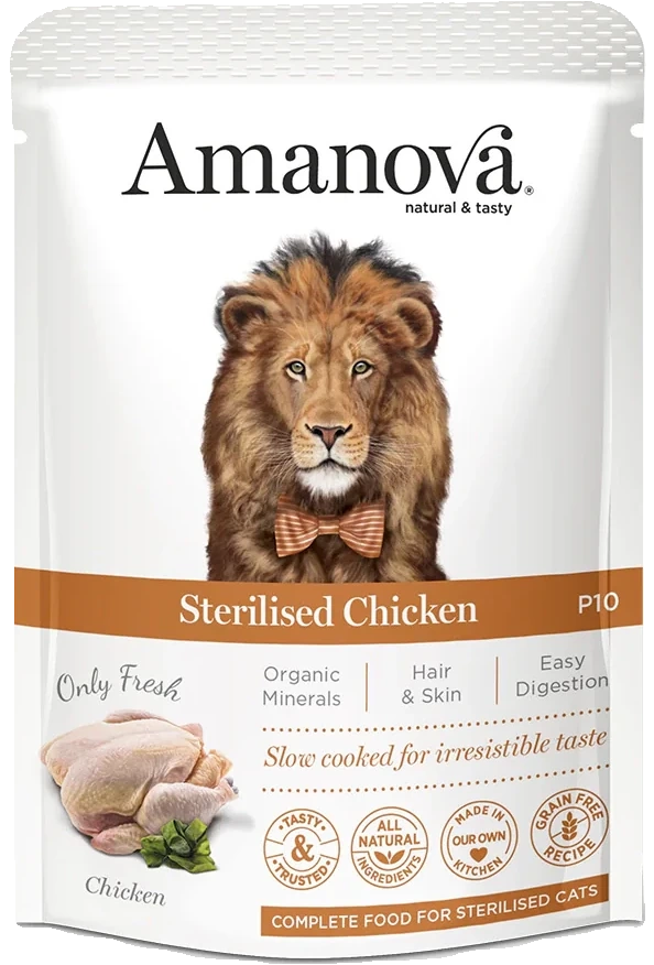 - Amanova Karma dla Kota po Sterylizacji Kurczak 85g to zdrowe pożywienie dla Twojego kota z 97% zawartością mięsa i mega prostym składem.
