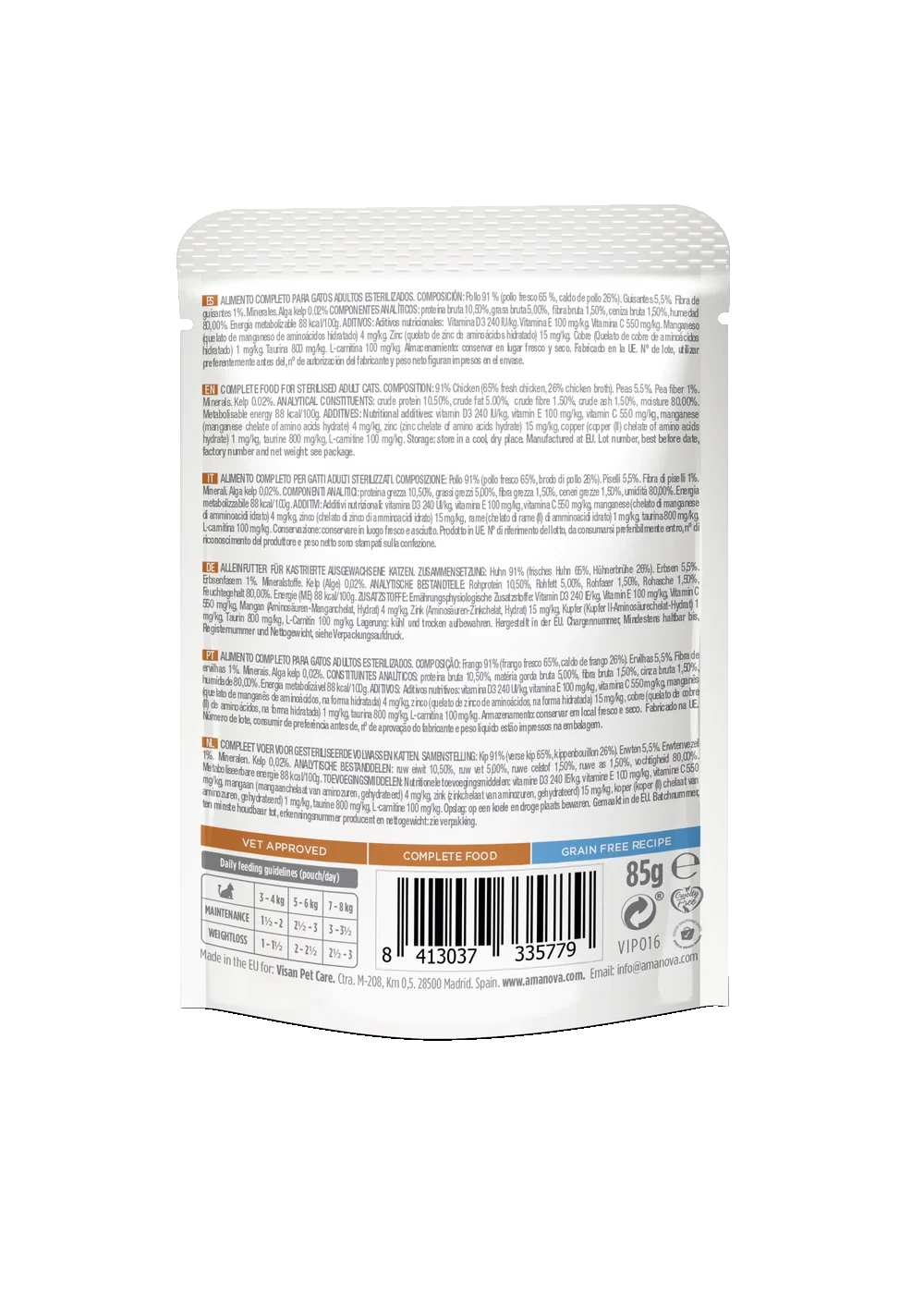 Amanova Karma dla Kota po Sterylizacji Kurczak 85g zdrowa i bogata w świeże mięso karma dla dorosłych kotów po zabiegu sterylizacji/kastracji.