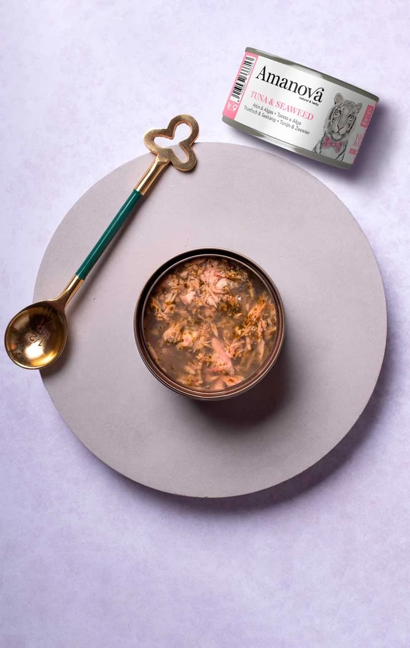 Mokra karma dla kota Amanova z soczystym tuńczykiem oraz wodorostami w galaretce.