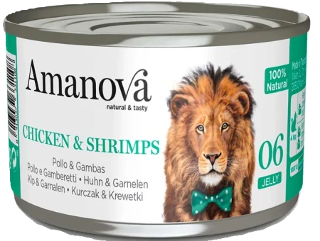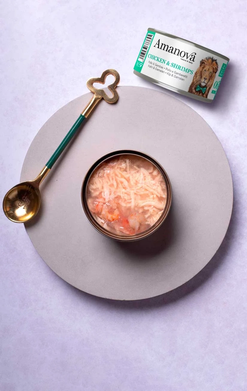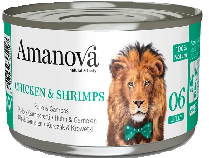 Mokra karma dla kota Amanova z soczystym mięsem kurczaka oraz krewetkami.