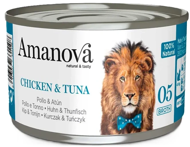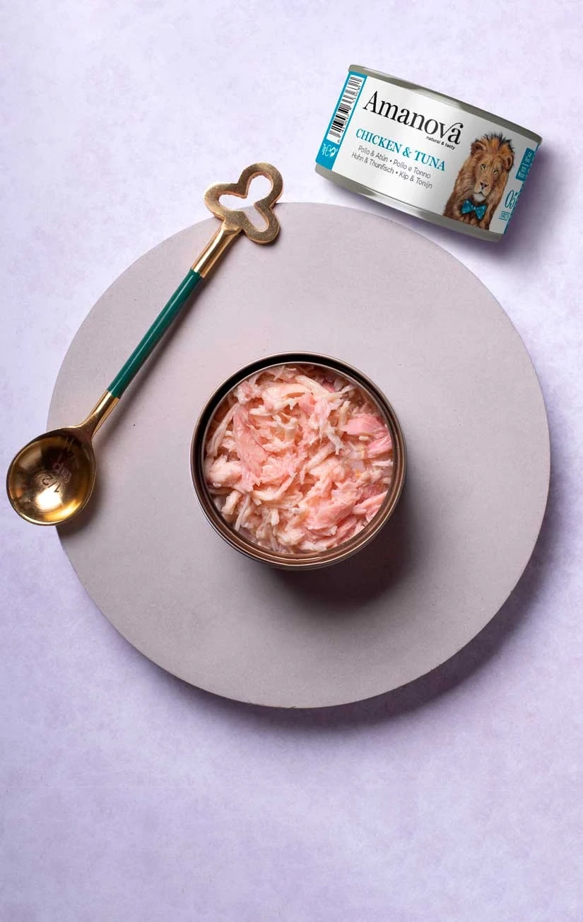 Mokra karma dla kota Amanova z soczystym mięsem kurczaka z tuńczykiem.