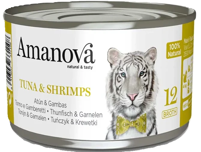 Mokra karma dla kota Amanova z soczystym tuńczykiem oraz aromatycznymi krewetkami.