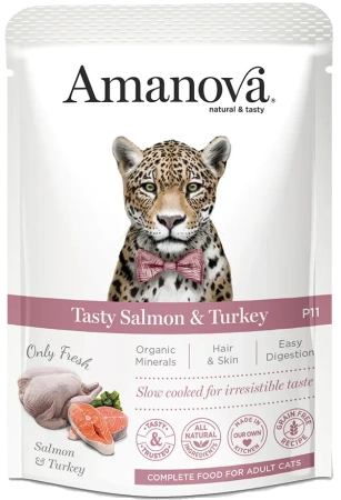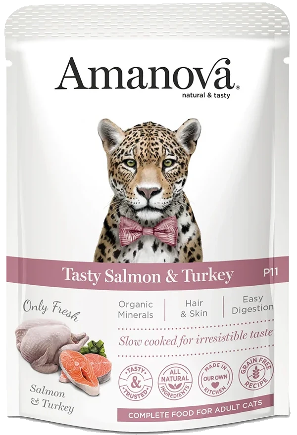 - Amanova Tasty Karma dla Kota Łosoś Indyk 85g to zdrowe pożywienie dla Twojego kota z 97% zawartością mięsa i mega prostym składem.