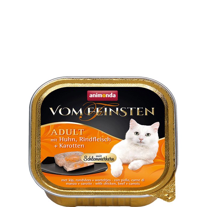 Animonda vom Feinsten z kurczakiem wołowiną i marchwią to pełnowartościowa karma mokra dla kotów.  Przygotowana jest ze składników najwyższej jakości. Ma wysoką zawartość mięsa i szeroką gamę smaków, dzięki czemu znajduje uznanie nawet najwybredniejszych kotów. Nie zawiera soi , konserwantów i sztucznych barwników.