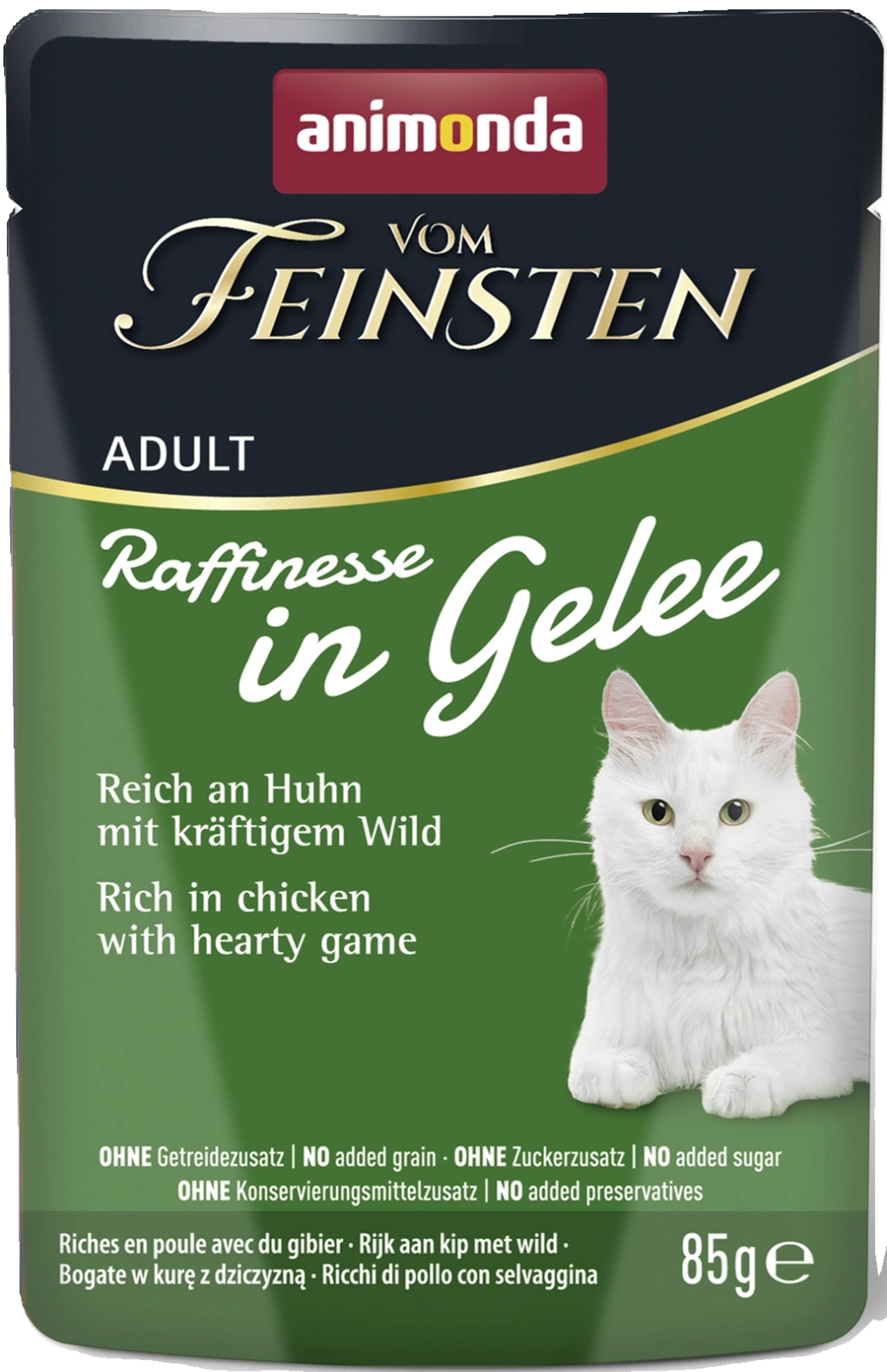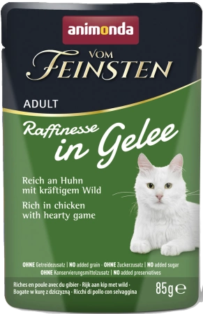 Mokra karma dla kota Animonda Vom Feinsten Raffinesse to smakowite mięso kurczaka oraz dziczyzny, w aromatycznej galaretce.