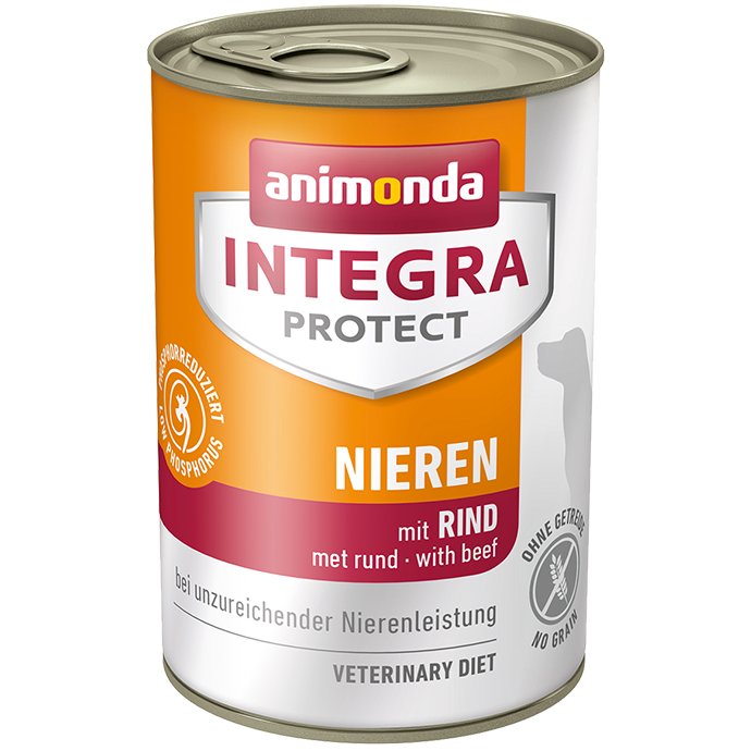 Animonda Integra Protect Nieren to dietetyczna zbilansowana karma dla psów chorujących na przewlekłą niewydolność nerek. Dzięki niskiemu stężeniu fosforu i zmniejszonej zawartości białka karma pomaga w ograniczeniu niewydolności nerek. Produkt bezzbożowy.