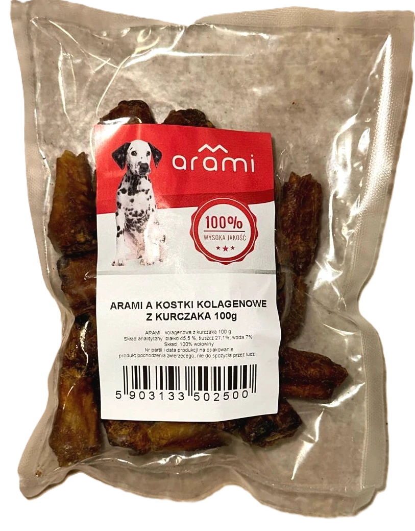 • Arami Przysmak Dla Psa Kostki Kolagenowe z Kurczaka 100g to naturalna przekąska na stawy dla Twojego pupila.