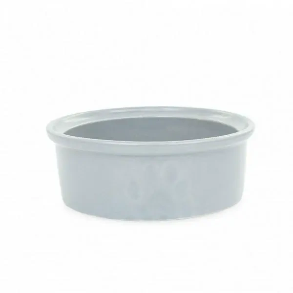 Ceramiczna miska dla psa jest w kolorze szarym, z bardzo subtelnym, wtłoczonym wzorem łapki.