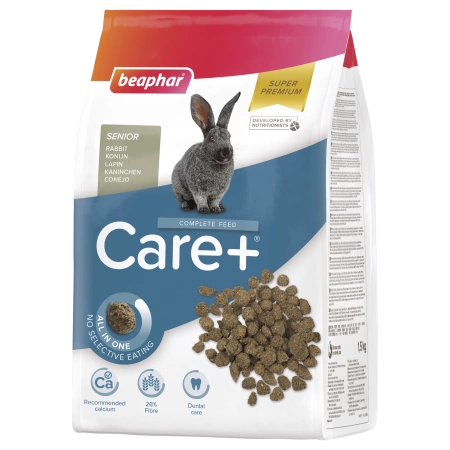 Care+ Senior Rabbit to wyjątkowo smaczna, karma klasy Super Premium. Jej receptura została opracowana przy współudziale lekarzy weterynarii i dietetyków. Care+ jest wytwarzana w procesie ekstruzji i dlatego każda granulka ma identyczny skład (wszystko w jednym). Dzięki temu zwierzęta nie pozostawiają żadnych resztek, a hodowcy mogą być pewni tego, że wszystkie niezbędne dla zdrowia składniki zostały spożyte – wyeliminowano w ten sposób całkowicie zjawisko selektywnego wyjadania smakowitszych składników karmy. Odpowiednia twardość granulek wpływa na prawidłowe ścieranie się zębów. Osiągana temperatura w trakcie produkcji poprawia przyswajalność białka. Granulki wyróżniają się niską zawartością wapnia, zrównoważonym poziomem ważnych wielonienasyconych kwasów tłuszczowych Omega 6 & Omega 3 (pochodzących z pszenicy, soi i siemienia lnianego), odpowiednią zawartością włókna pokarmowego i dodatkiem aromatycznego ekstraktu z tymotki łąkowej. Istotną funkcję przeciwutleniaczy spełniają witamina C, witamina E i ekstrakt z zielonej herbaty oraz żeń-szeń wspomagając w ten sposób naturalne siły obronne organizmu królika. Care+ Senior Rabbit posiada niską zawartość białka i nie zawiera dodatku cukru, aby zapobiegać otyłości u tych mniej aktywnych królików. Care+ Senior Rabbit jest idealnie zbilansowaną karmą dla starszych królików, która spełnia ich wszystkie naturalne potrzeby żywieniowe.