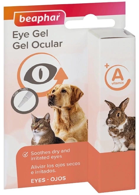 - Beaphar Eye Gel Żel do oczu z witaminą A łagodzi podrażnienia i wspiera oczyszczanie oka psa.