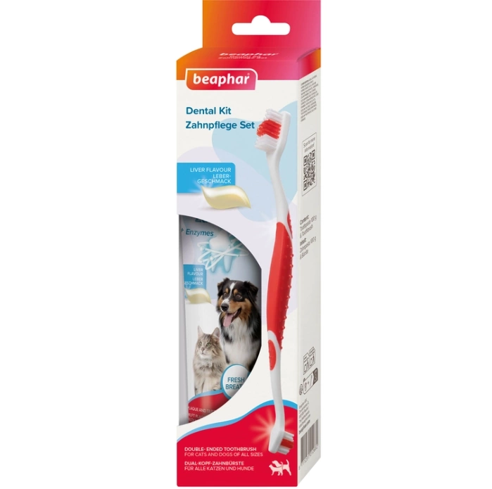 Zestaw Beaphar TOOTH COMBIPACK zawiera dwustronną szczoteczkę oraz pastę do zębów o smaku wątróbki (100g) z enzymami, stanowiąc kompletne rozwiązanie do codziennej higieny jamy ustnej.