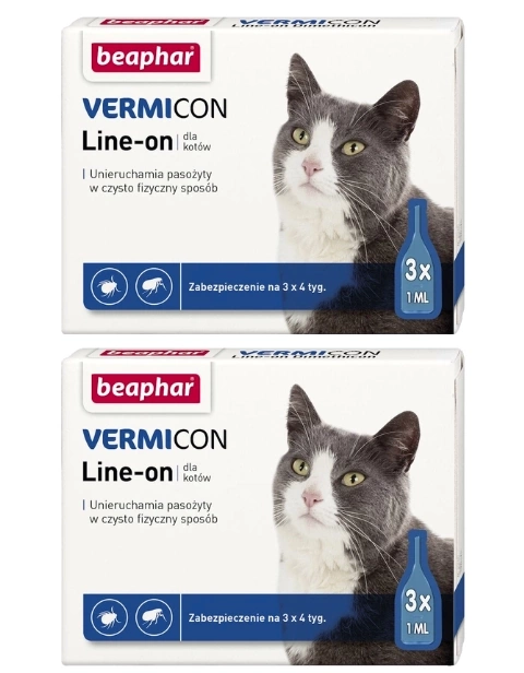 Vermicon Line-on Cat Beaphar to krople dla kota na kleszcze, pchły, wszy, muchy, komary i inne owady oraz roztocza. Zestaw 2 opakowań.