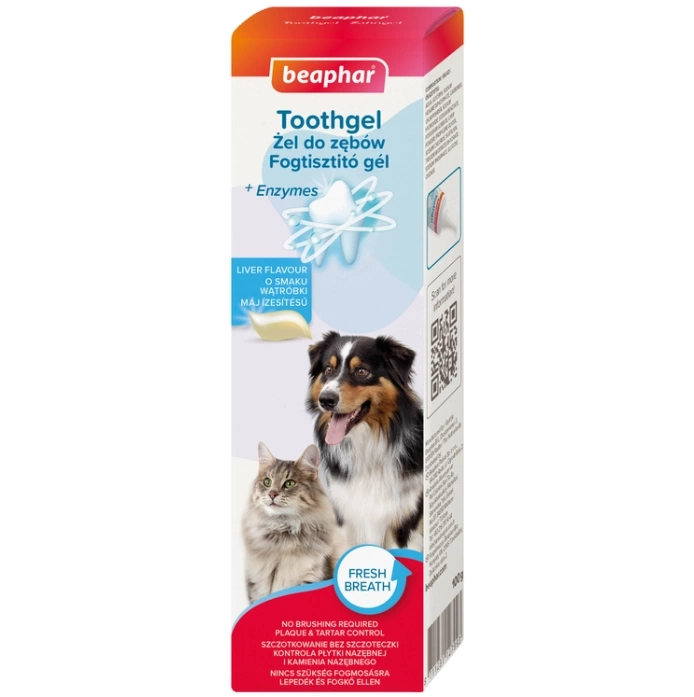 Zapobieganie zbieraniu się płytki bakteryjnej: różne bakterie i białka z resztek pożywienia gromadzą się na powierzchni zębów w postaci płytki bakteryjnej. Żel Beaphar zawiera enzymy zwalczające szkodliwe bakterie i rozkładające kamień nazębny.