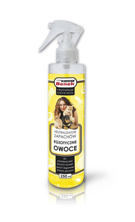 Nowej generacji neutralizator o zapachu egzotycznych, cytrusowych owoców. Skutecznie usuwa brzydkie zapachy, pozostawiając jednocześnie przyjemną dla otoczenia nutę zapachową. Zastosowana kompozycja olejków eterycznych tworzy przyjemny aromat, który jest akceptowany przez wszystkie zwierzęta domowe. Specjalnie dobrane składniki zapewniają długotrwałe działanie neutralizatora. Produkty dostępne w butelkach z dozownikiem w spray’u umożliwiającym łatwą aplikację preparatu i zastosowanie neutralizatora jako odświeżacza w pomieszczeniach, czy w pobliżu kocich kuwet, psich legowisk i klatek gryzoni.