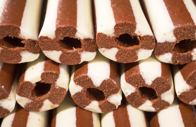 Smakowity mięsny przysmak w postaci półmiękkich rurek do żucia i gryzienia.