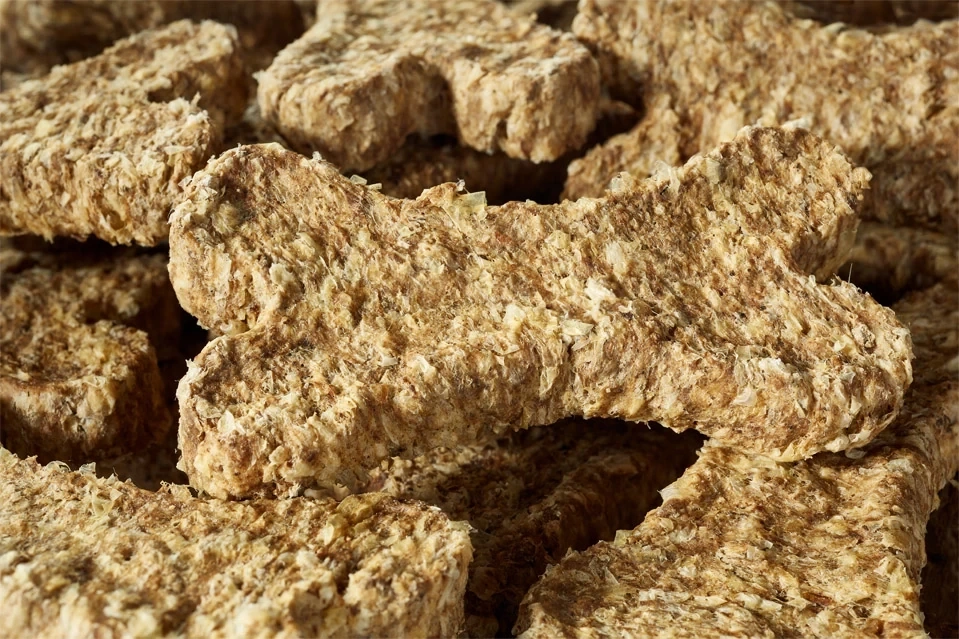 Przysmak dla psa, w postaci mięsnych kostek z dodatkami.