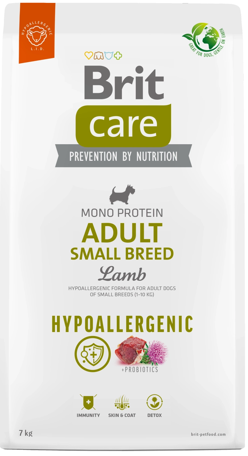 Brit Care Hipoalergiczna Karma Dla Psa Jagnięcina 7kg specjalnie przygotowana formuła pełnoporcjowej suchej karmy dla dorosłych psów małych ras (1-10 kg).