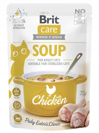 - Brit Care Mokra Karma dla Kota Zupa z Kurczakiem 75g to bezzbożowa, uzupełniająca karma dla Twojego kota z tauryną.