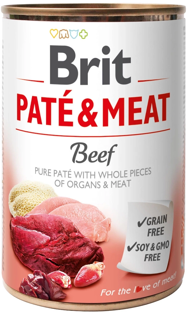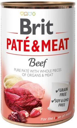 Bez zbóż. Bez dodatku konserwantów. 70% wołowina i indyk. Brit Pate&Meat Beef zapewnia kompletne i zbilansowane żywienie. Karmę należy podawać w temperaturze pokojowej. Dawkowanie karmy może różnić się w zależności od aktywności psa i środowiska, w którym żyje. Podając puszkę celem urozmaicenia i wzbogacenia smaku posiłków, należy odpowiednio pomniejszyć dzienną porcję karmy podstawowej. Należy zapewnić psu dostęp do świeżej wody.Przechowywać w suchym i chłodnym miejscu. Po otwarciu przechowywać w lodówce