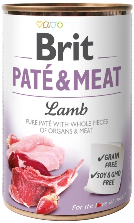 Bez zbóż. Bez dodatku konserwantów. 70% jagnięcina i kurczak. Brit Pate & Meat Lamb zapewnia kompletne i zbilansowane żywienie. Karmę należy podawać w temperaturze pokojowej. Dawkowanie karmy może różnić się w zależności od aktywności psa i środowiska, w którym żyje. Podając puszkę celem urozmaicenia i wzbogacenia smaku posiłków, należy odpowiednio pomniejszyć dzienną porcję karmy podstawowej. Należy zapewnić psu dostęp do świeżej wody.Przechowywać w suchym i chłodnym miejscu. Po otwarciu przechowywać w lodówce