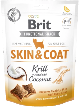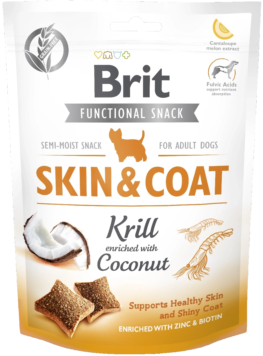 Brit Skin & Coat Krill Coconut 150g to uzupełniająca karma dla psów o smaku krylu i kokosa. Przysmak dla psów wspiera skórę i sierść pupila. Poprawia kondycję i wygląd sierści i skóry psa. Podawaj między posiłkami oraz zadbaj o zrównoważoną dietę psa.