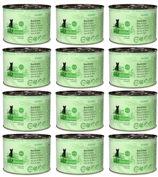 - Catz Finefood Classic Karma dla Kota Wół Kaczka 12x200g to wysokiej jakości, bogata w mięso karma mokra dla Twojego kota bez zbóż. Zestaw 12 puszek.