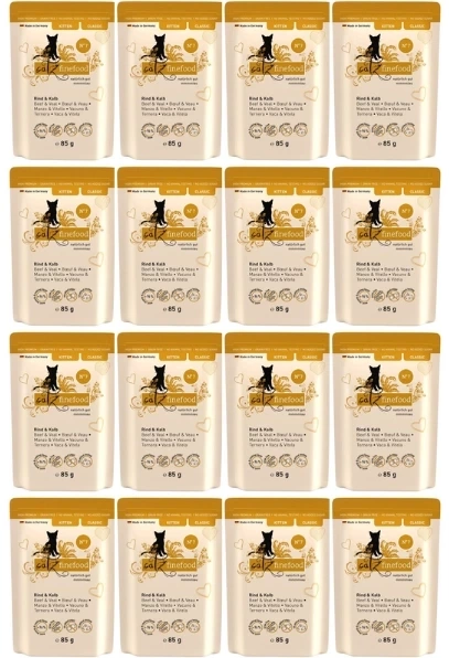 - Catz Finefood Classic Kitten N.07 Wołowina Cielęcina 16x85g to mokra karma dla kociąt bogata w świeże mięsne połączenie.