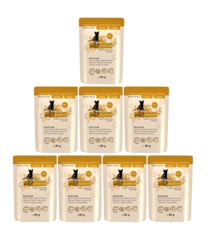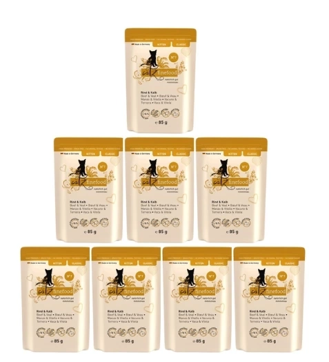 - Catz Finefood Classic Kitten N.07 Wołowina Cielęcina 8x85g to mokra karma dla kociąt bogata w świeże mięsne połączenie. W zestawie 8 saszetek.