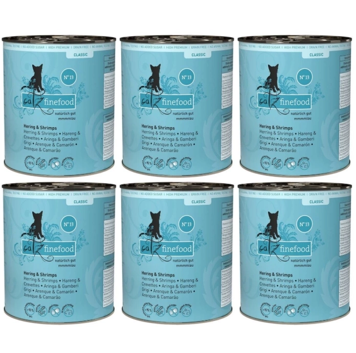 - Catz Finefood Classic N.13 Śledź i Krewetki Puszka 6x800g to wartościowa mokra karma dla Twojego kota ze świeżym mięsem.