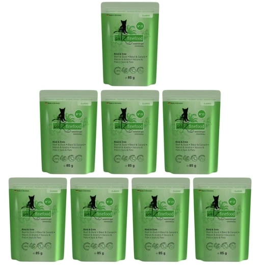- Catz Finefood Classic N.23 Wołowina Kaczka Saszetka 8x85g to mokra karma dla kota z wołowiną i kaczką. Zestaw 8 saszetek.