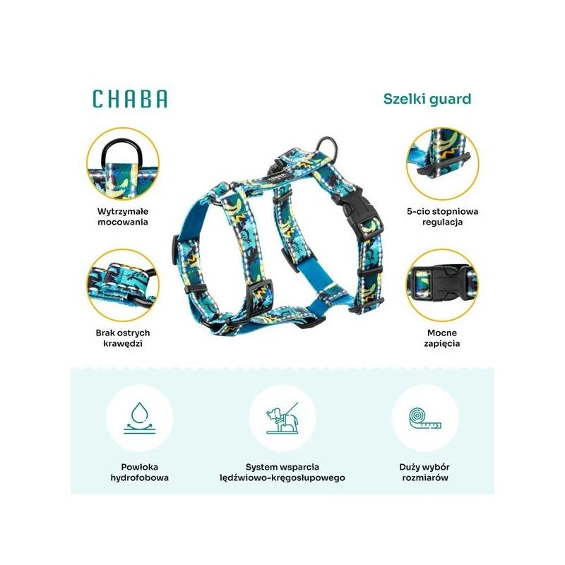 - Chaba Guard Szelki Dla Psa L Carnival 2,5/50-57cm są produktem najwyższej jakości. Wodoodporne, komfortowe i regulowane. Nie obciążają układu kostnego psa.