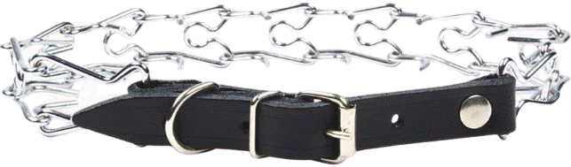 Obroża typu „kolczatka” w której, zamiast łańcuszka zaciskowego zastosowano elementy obroży skórzanej.