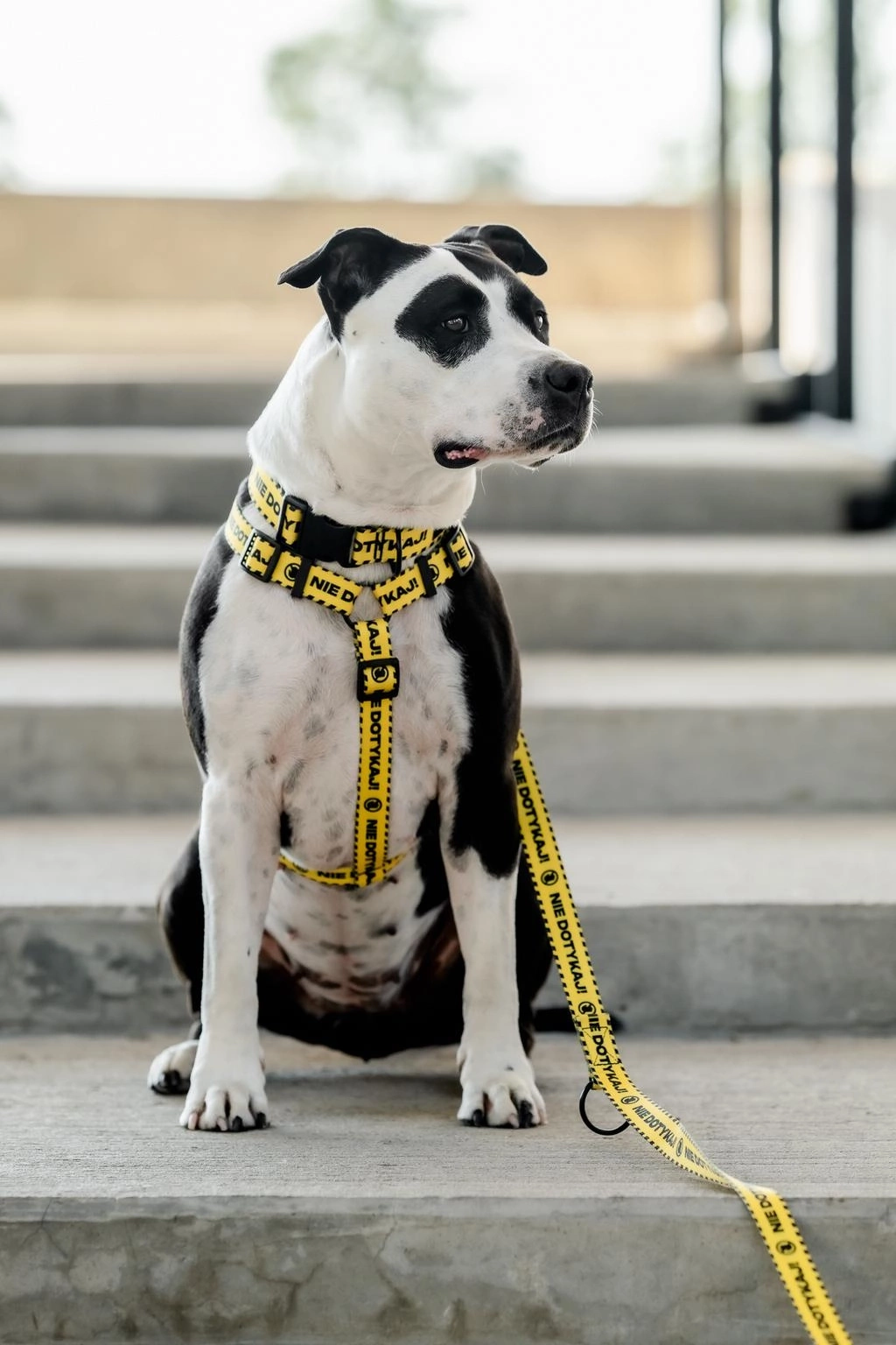 W jaskrawym żółtym kolorze, z czarnym napisem "nie dotykaj!"- wyraźnym komunikatem, który informuje, że Twój pies potrzebuje przestrzeni.