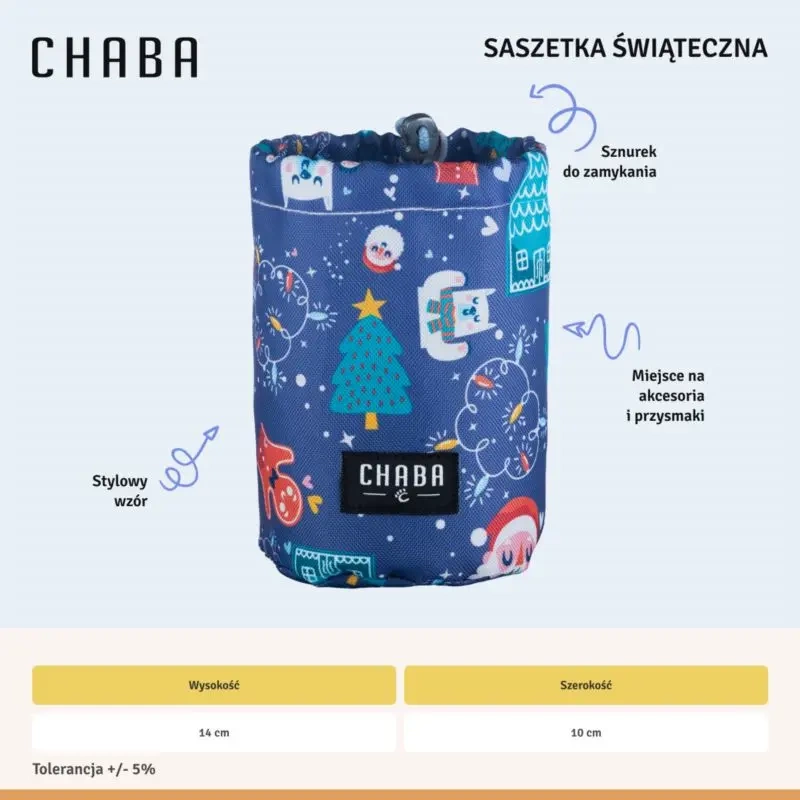 - Chaba Świąteczna Saszetka na Smakołyki dla Psa Niebieska przyda się na przysmaki podczas treningów lub jako worek na prezenty na nadchodzące święta!