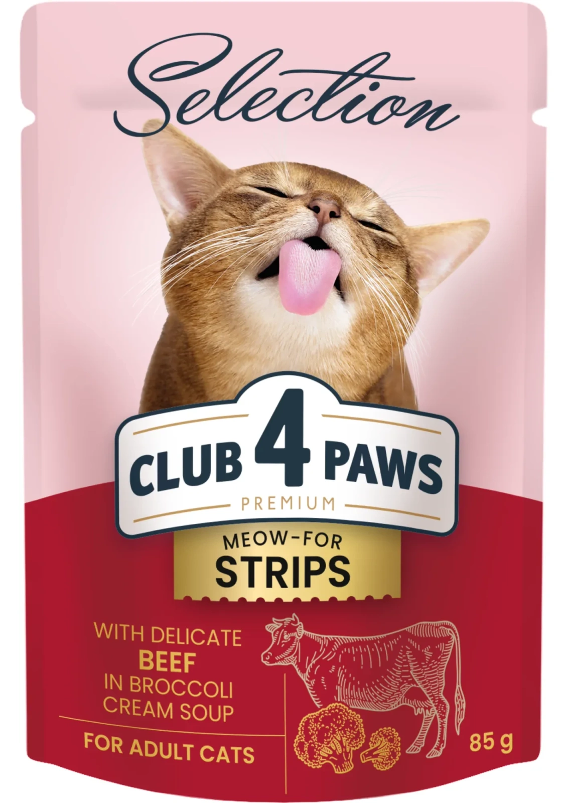 - Club4Ł Kot 80g Paski Wołowina z Brokułami to smaczna propozycja karmy mokrej dla kotów dorosłych.