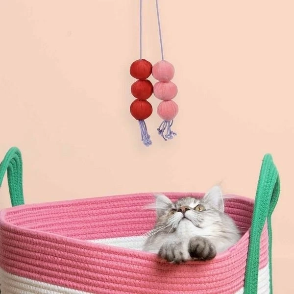 Pluszowa zabawka dla kota, która zaciekawi Twojego pupila. To pluszowe, czerwono-różowe piłeczki na długim sznurku.