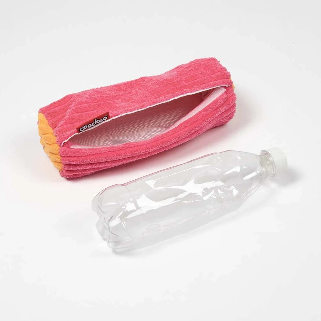 Z różowo-pomarańczowego sztruksu z praktycznym zapięciem na rzep.