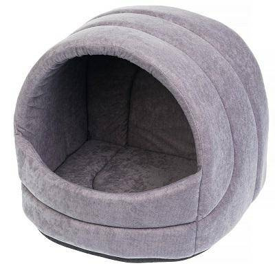 Legowisko dla kota i psa, w postaci owalnej budki. Budka w kolorze szarym.