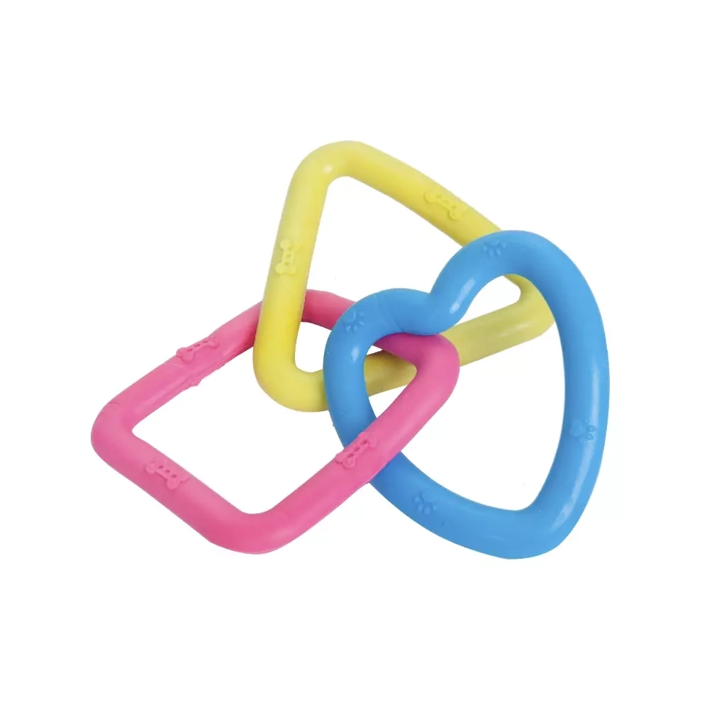 Gumowy Gryzak dla Psa do Przeciągania odwróci uwagę Twojego psa od gryzienia mebli czy Twoich kapci. Składa się z 3 połączonych na stałe ze sobą elementów. Mają one różne kształty i kolory.