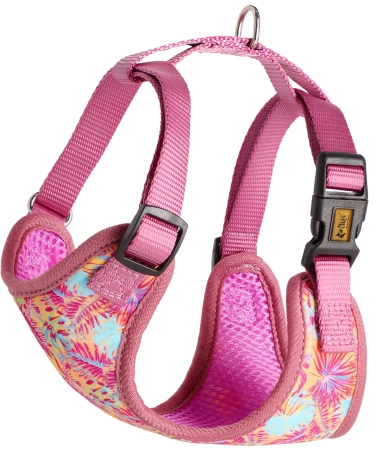 Bezuciskowe szelki dla psa Dingo w rozmiarze M, dedykowane psom ras średnich. W kolorze różowym, z motywem egzotycznych roślin.