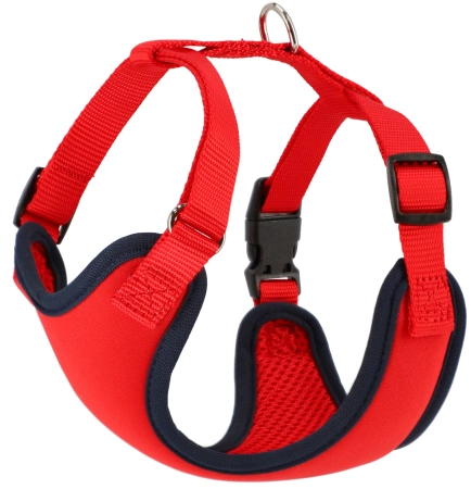 Szelki dla psa Dingo w rozmiarze XS, dedykowane psom ras małych. W kolorze czerwonym, z granatowym obszyciem.