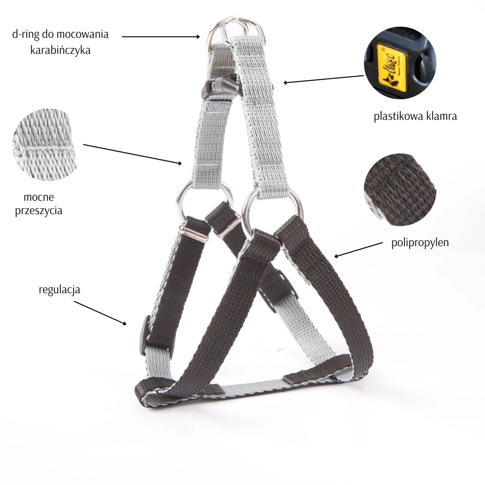 Taśmy szelek są podwójne i regulowane, co pozwala na idealne dopasowanie do budowy ciała Twojego pupila. Mocowanie smyczy do chromowanych kółek z tyłu zapewnia wygodę i bezpieczeństwo, a chromowane elementy są odporne na rdzę, co gwarantuje długotrwałe użytkowanie. Ten sposób mocowania jest szczególnie praktyczny, gdy pies ma na sobie zimowe ubranie.