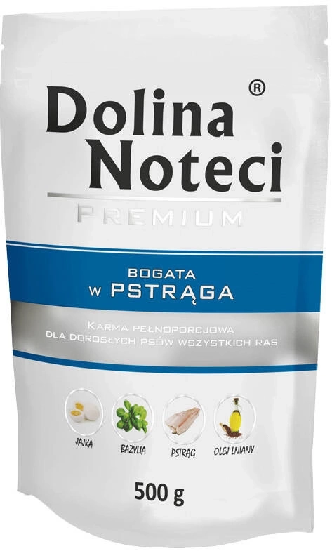 Pełnoporcjowa karma Dolina Noteci dla dorosłych psów wszystkich ras bogata w pstrąga 500 g - delikatne i chude mięso z pstrąga dostarcza najwięcej spośród ryb słodkowodnych cennych kwasów omega-3, które odgrywają ważną rolę w profilaktyce chorób serca i układu krążenia. Tłuszcz z pstrąga uzupełnia dietę psa w cenne kwasy EPA i DHA. Składniki mineralne odgrywają istotną rolę w stymulacji funkcji obronnych organizmu.