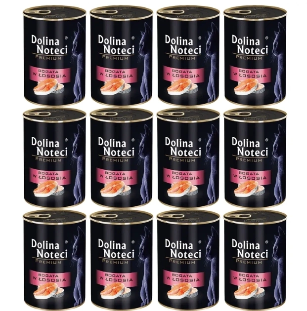 - Dolina Noteci Premium Mokra Karma dla Kota Łosoś 12x400g to zestaw bogatej w łososia karmy mokrej dla kotów.